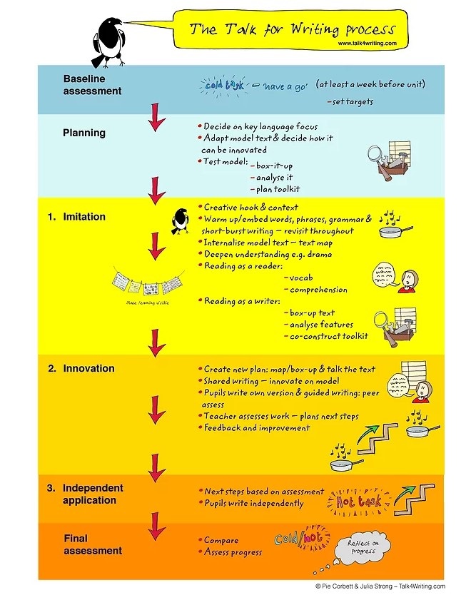 The final part of the Talk for Writing process is ‘innovation’. Over the previous weeks the children will have been equipped with the skills required for inventing their own text from beginning to end. They will come up with their own ideas and be able to box them up. They will then be able to produce an independent piece of writing (hot write) showcasing their text. Children will then have the opportunity to edit their writing at the end of the process.