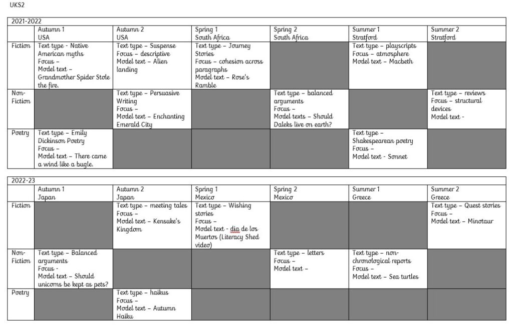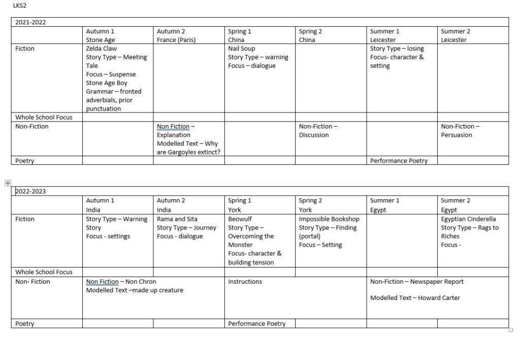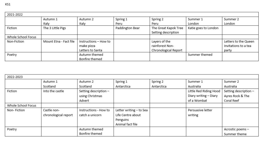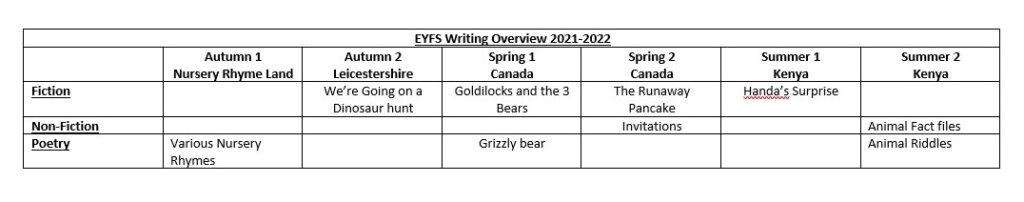 Year groups are encouraged to expose children to a range of texts and genres alongside story types. Each year group should also experience ‘short burst’ writing to rehearse skills.